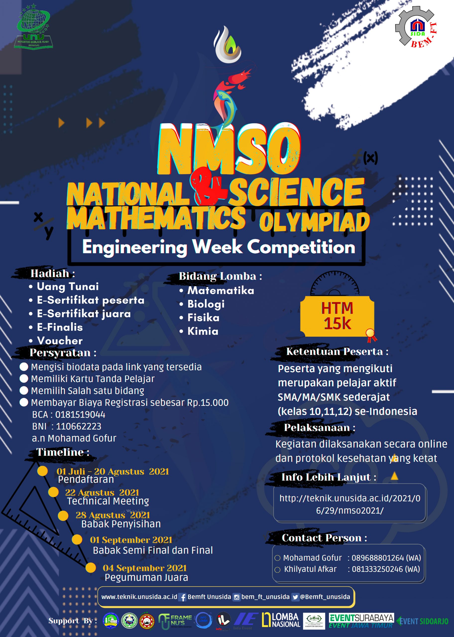 Sejak adanya pandemi Covid-19, semua sektor di dunia mengalami penurunan seperti sektor pendidikan, ekonomi, sosial, dan lain-lain. Segala upaya dilakukan untuk memulihkan keadaan ini. Perlahan-lahan semua membaik dengan New Normal Life. Salah satu sektor yang mengalami hambatan karena pandemi ini adalah sektor pendidikan. Sektor Pendidikan merupakan sektor yang menunjang kemajuan teknologi dan perkembangan ilmu pengetahuan. Untuk memulihkan kembali aktivitas akademik yang sempat vakum, Badan Eksekutif Mahasiswa Fakultas Teknik Universitas Nahdlatul Ulama Sidoarjo (BEM-FT UNUSIDA) berniat untuk membakar semangat para siswa-siswi SMA/ MA Sederajat di Indonesia untuk mengikuti lomba matematika dan sains untuk mengobarkan semangat dalam belajar dan berkompetisi, menjunjung nilai kejujuran, serta meningkatkan kemampuan di bidang ilmu pengetahuan.