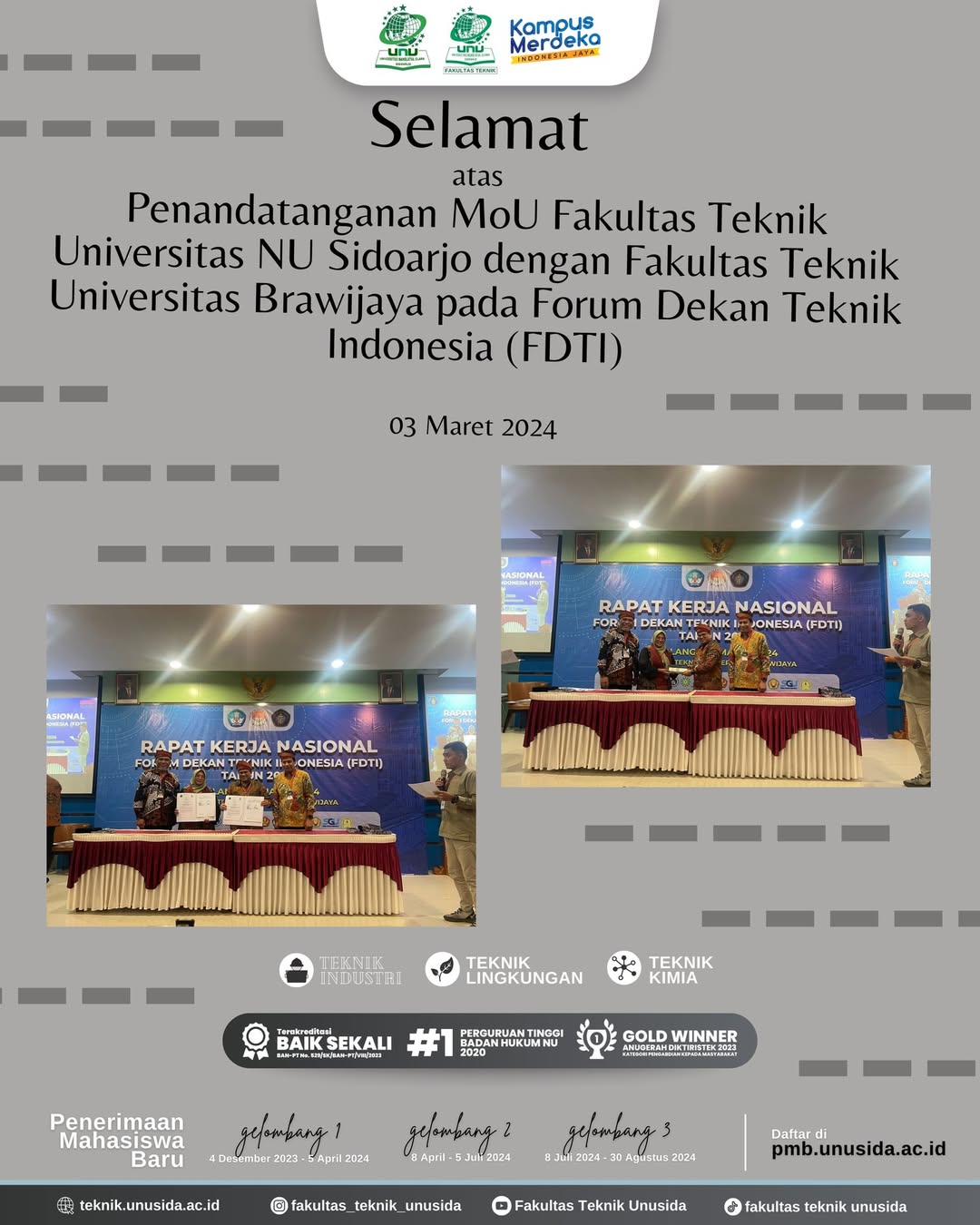 Selamat atas Penandatanganan MoU Fakultas Teknik Universitas NU Sidoarjo dengan Fakultas Teknik Universitas Brawijaya pada Forum Dekan Teknik Indonesia (FDTI)