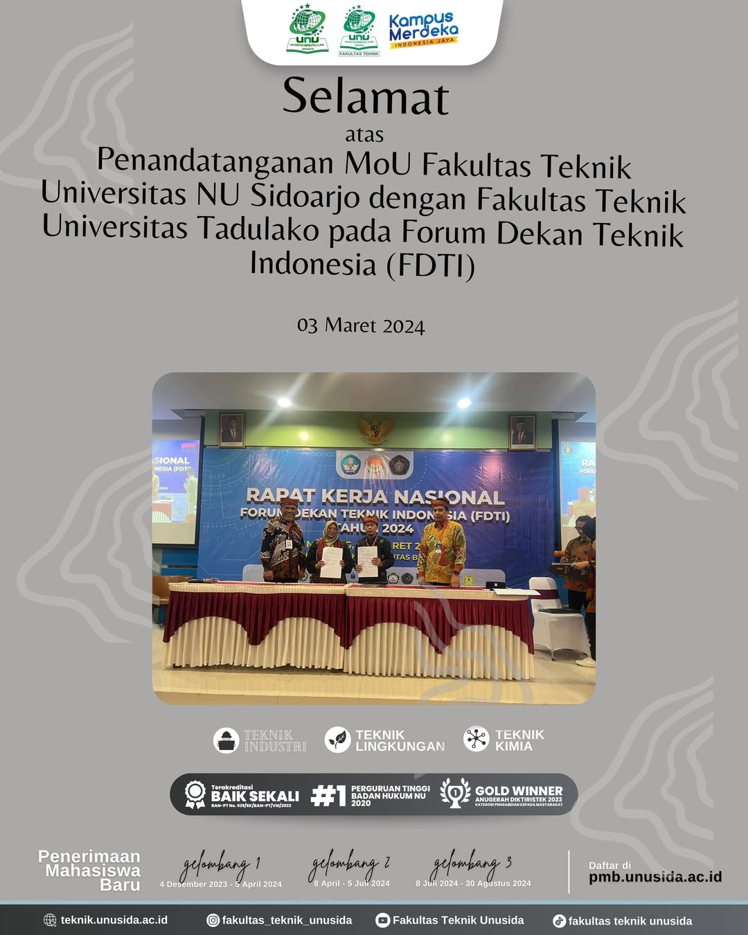 Selamat atas Penandatanganan MoU Fakultas Teknik Universitas NU Sidoarjo dengan Fakultas Teknik Universitas Tadulako pada Forum Dekam Teknik Indonesia (FDTI)